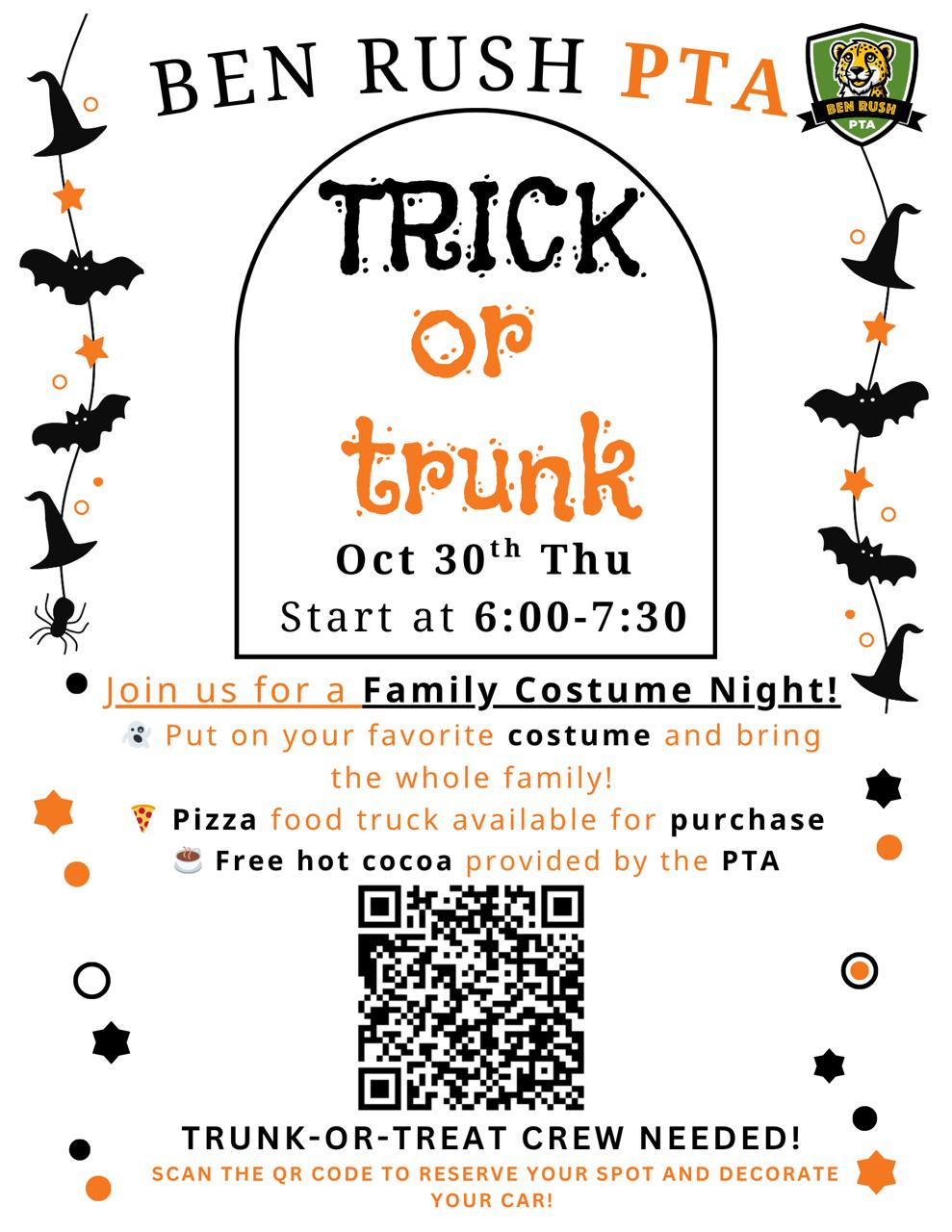 🎃 Ben Rush’s First Halloween Trunk-or-Treat Date: Thursday, October 30 Time: 6:00p - 7:30p Where: Ben Rush Parking Lot ics: | 12:00a Ben Rush PTA Fall Fundraiser Deadline